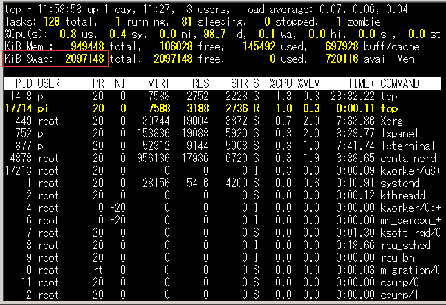 これまであまり意識することなかったんですが、ラズパイ(Raspbian) をデフォルトのまま使っている時のスワップサイズって 100MB しかないんですね。。