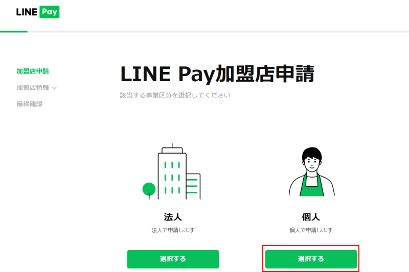ここから加盟店としての登録が始まります。まず加盟店申請の最初に「法人」か「個人」かを選択します。今回は個人登録なので、個人の側にある「選択する」ボタンをクリックします: