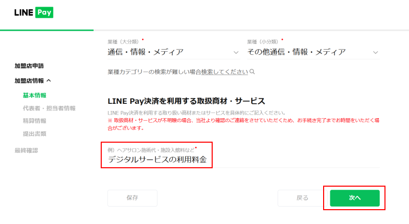 画面下部で取引商材を記入する欄があります。ここにはフリーテキストで商材となるものを入力します。最後に「次へ」ボタンをクリックします: