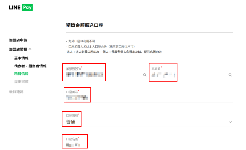 次に精算金の振込銀行口座を指定します。金融機関名、支店名、口座種類、口座番号、口座名義を入力します: