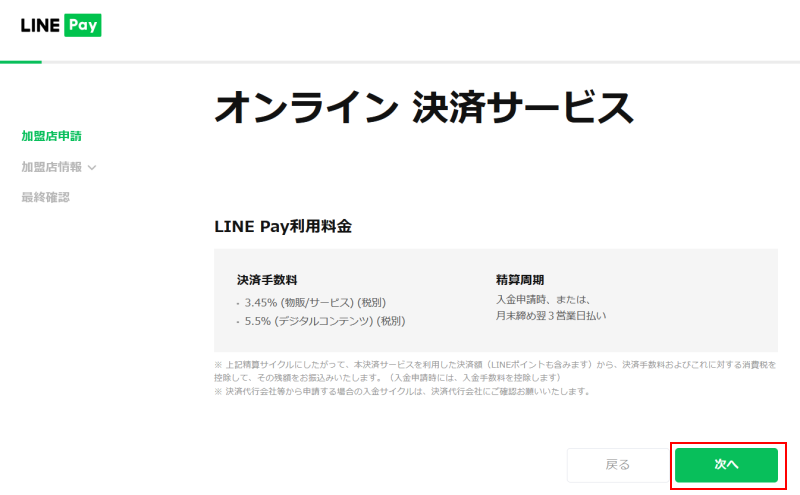 オンライン決済サービスの利用料金が表示されます(これによるとデジタルコンテンツの決済手数料は 5.5% らしいです、ふむふむ)。内容を確認したら「次へ」ボタンをクリックします: