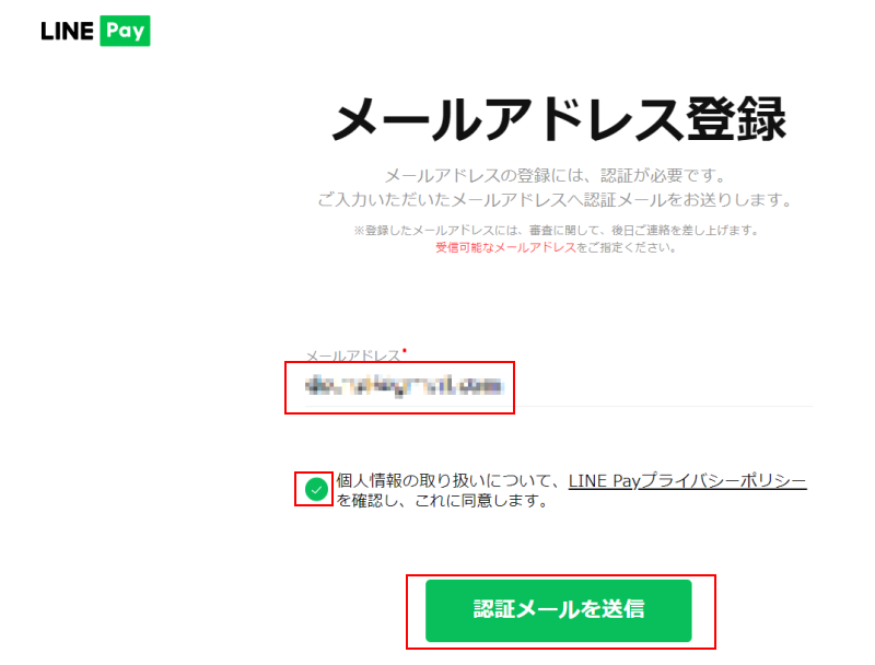 というわけで、以下はメールでの登録手順となります。最初にメールアドレスを登録します。この後、このアドレスにメールが送信されるので、受け取ることができるアドレスを入力します。そして個人情報取り扱いにチェックを入れて、「認証メールを送信」ボタンをクリックします: