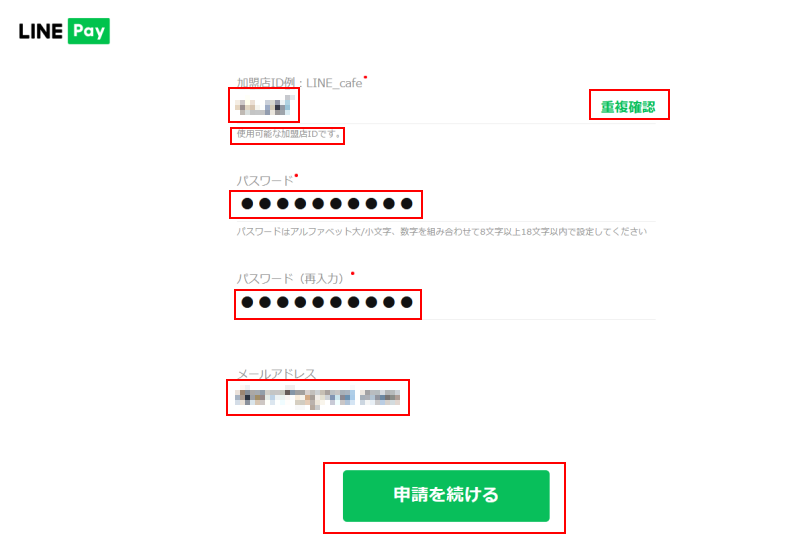 ここから実際に登録する加盟店の情報を入力していきます。まず LINE Pay 加盟店ダッシュボードにアクセスするための加盟店 ID (となる文字列)※1を入力し、右の重複確認を押します。IDの下に「使用可能」と表示されれば、その ID を使うことができます。その後、この ID のパスワードを入力し、再度メールアドレスを入力して、「申請を続ける」ボタンをクリックします: