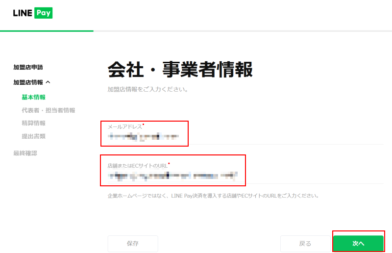 会社・個人事業者の情報として、メールアドレスと店舗またはサイトの URL を指定します(ここ、僕はまだ完成していないサイトなので、アクセスしても認証を求められるだけのアドレスを指定したのですが、審査大丈夫かな・・・)。最後に「次へ」ボタンをクリックします: