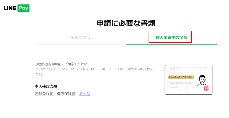 「申請に必要な書類」という項目があります。今回は個人事業主として申請するので、「個人事業主の場合」を選択して内容を確認し、同時に必要な書類(身分証明書を撮影した画像ファイル)を用意します: