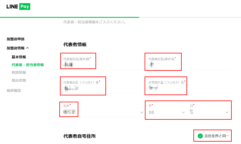 次は会社・個人事業主の代表者の情報を入力します。個人事業主の場合は先ほどと同じ情報を入力することになると思います。また代表者自宅住所が「会社住所と同一」である場合は、ここにチェックを入れます: