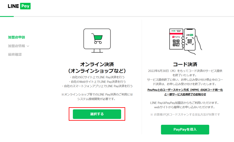 次に決済手段を選択します。今回自分は自分で開発するウェブアプリ上でのオンライン決済を行うための申請なので、オンライン決済側の下にある「選択する」ボタンをクリックします: