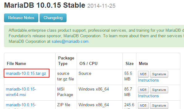 ダウンロードサイトから "Source" と書かれた mariadb-X.X.X.tar.gz(X.X.X はバージョンなので、今回であれば 10.0.5)のリンクをクリックして、このファイルをダウンロードします: