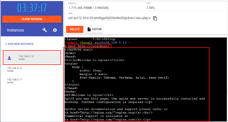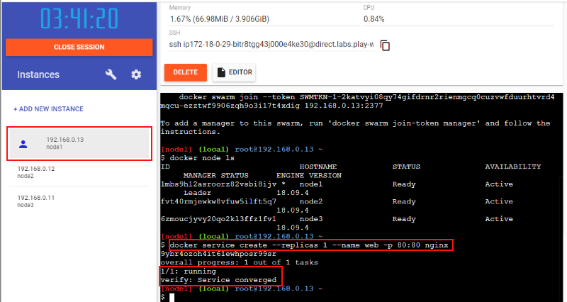 改めて node1 ノードで nginx のイメージを使って 80 番ポートで、1インスタンスで、"web" という名前でサービスを作成します: