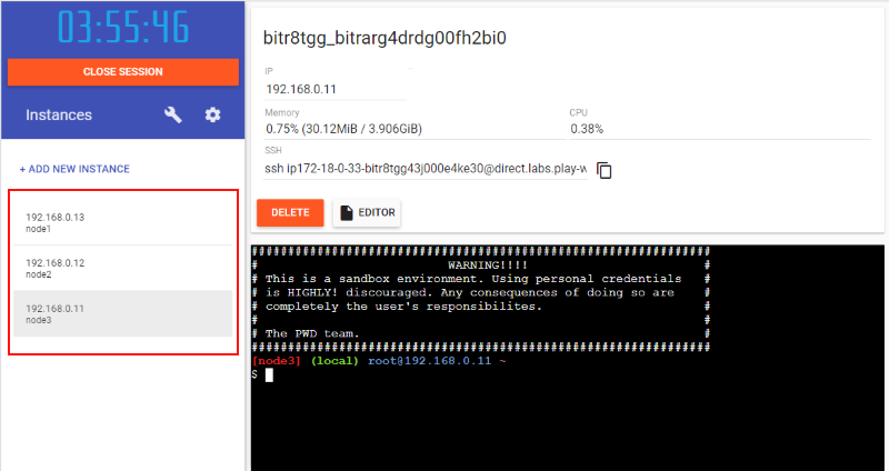 今回はクラスタリング環境を構築したいので、更に2つの Docker ノードインスタンスを追加します(合計3つにします)。あともう2回 "+ ADD NEW INSTANCE" をクリックして、"node2" と "node3" を追加します。こんな感じで Docker ノードを気軽に増やせるのは本当に便利です。。
