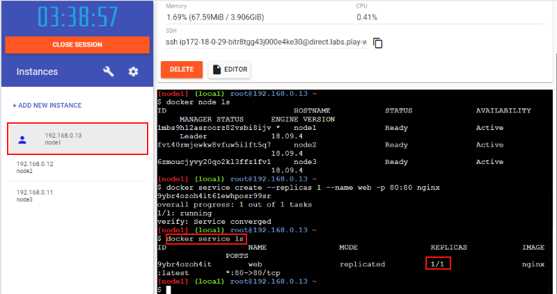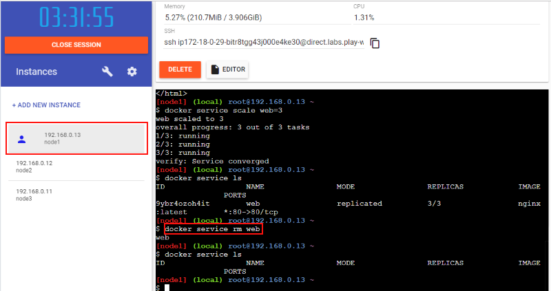 最後に作成したサービス(web)を削除する方法を紹介しておきます。node1 で以下のコマンドを実行します: