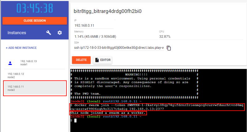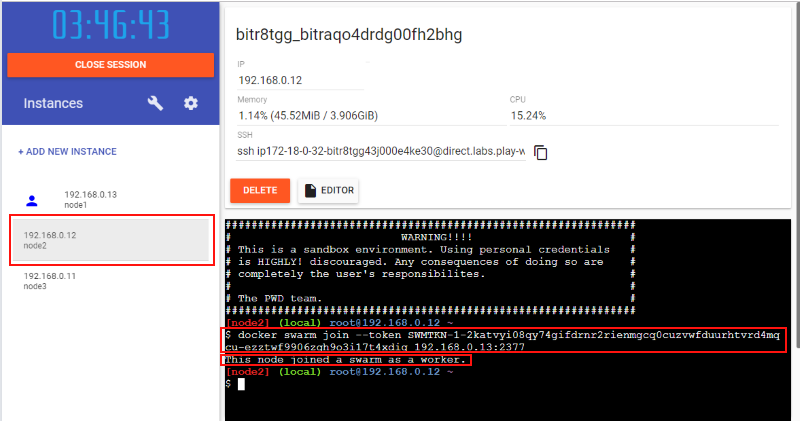 では次にワーカーノードをこの管理ノードに接続します。先程の管理ノードでのコマンド出力結果の "docker swarm join --token XXXXXX..." 部分をそのまま node2 のコンソールにコピー&ペーストして実行します:
