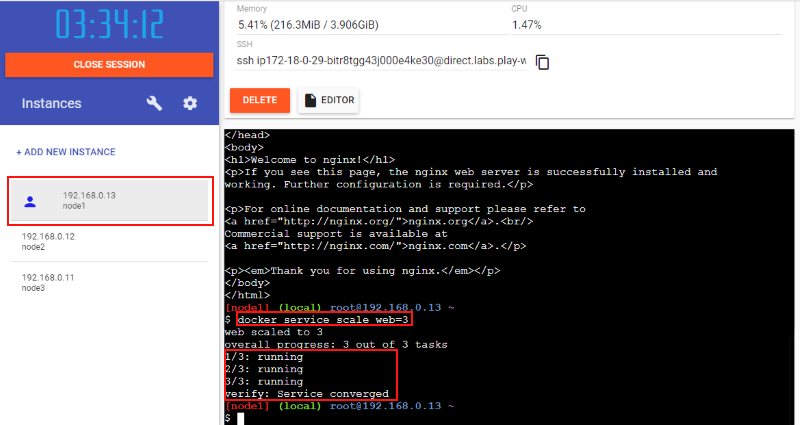 では、現在1インスタンスで稼働しているこのサービスを複数インスタンスとなるように node1 でスケールアウトさせてみます: