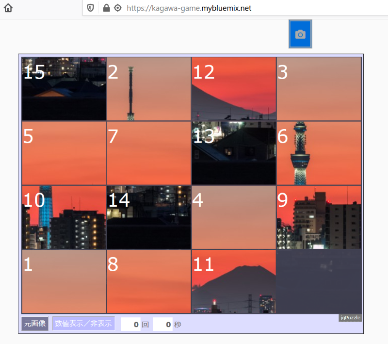 すると選んだ画像が懐かしいスライドパズルとなって遊べる、というものです。一応移動回数やゲームを解くまでの時間がカウントされていて、競技性のある作りにしています: