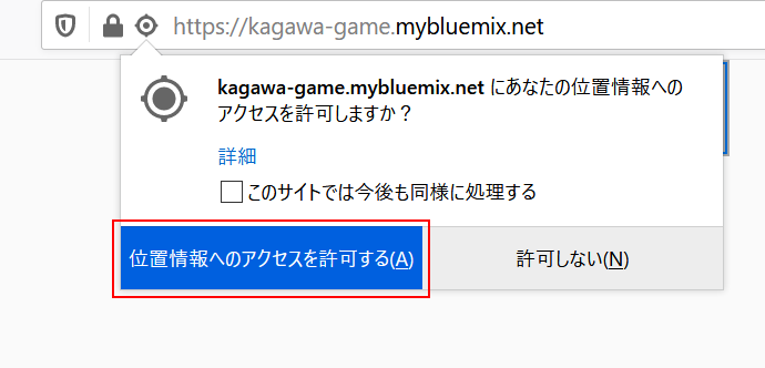 上記 URL にウェブブラウザでアクセスすると、以下のような位置情報へのアクセス許可を促すメッセージが表示されるので「許可」を選択してください(以下は FireFox を使った場合の画面です):