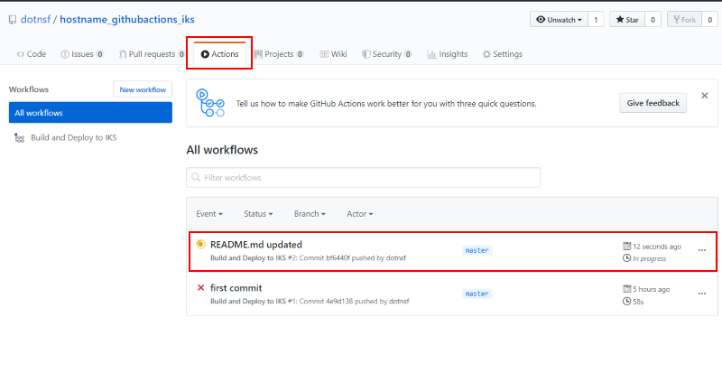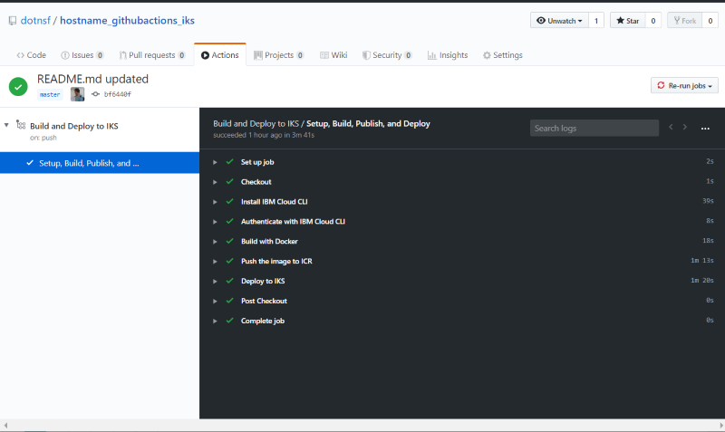 $ cd hostname_githubactions_iks $ git add . $ git commit -m 'README.md updated.' $ git push