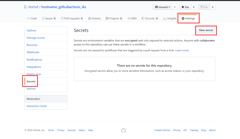 そのための設定を行います。 https://github.com/XXXXX/hostname_githubactions_iks を開き、"Settings" タブを選んで左メニューから "Secrets" を選択します。このプロジェクトに設定されたシークレット情報の一覧が表示されますが、最初は空のはずです。ここにシークレット情報を追加するため "New secret" ボタンをクリックします: