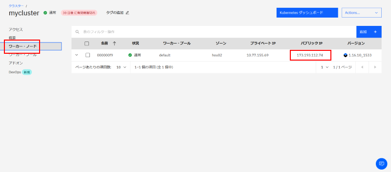 まず公開されているパブリック IP アドレスは IBM Cloud ログイン後のダッシュボードから確認することができます。作成した IKS のワーカーノードを表示し、稼働しているサービスのパブリック IP を確認します。これが外部アクセス用の公開 IP アドレスとなっています: