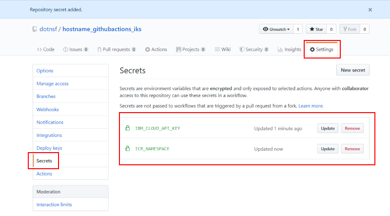 iks.yml ファイルの中身はこの後で参照しますが、このファイルは Github のプロジェクトのシークレット情報を参照して動くよう定義されています。したがって必要なシークレット情報を Github プロジェクト内にあらかじめ定義しておく必要があります。