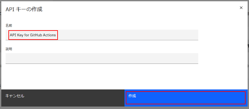 ダイアログが表示されるので API キーの名称(任意ですが、例えば "API Key for GitHub Actions" など)を入力して「作成」します: