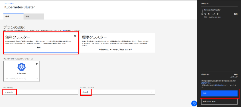 IKS は有償版と無償版(30日経過後に削除)があります。以下は無償版である「無料クラスター」を選択している想定で紹介を続けます。クラスター名は "mycluster" 、リソースグループは "Default"(いずれも既定値)として画面右の「作成」ボタンをクリックします: