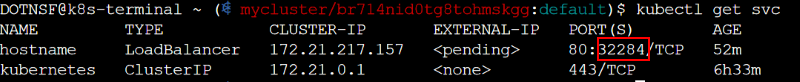 またポート番号は Web 端末から "kubectl get svc" を実行し、サービス名(iks.yml で指定したデプロイ名、上述の例だと hostname)の PORT(S) 列を参照します。 "80:*****/TCP" と表示されている ***** 部分(下図の場合は 32284)がサービスにアクセスするためのポート番号となります: