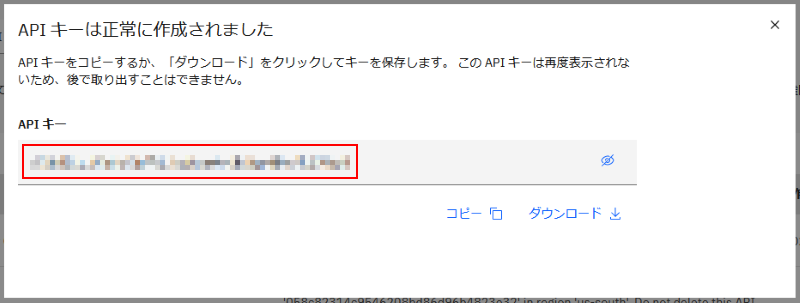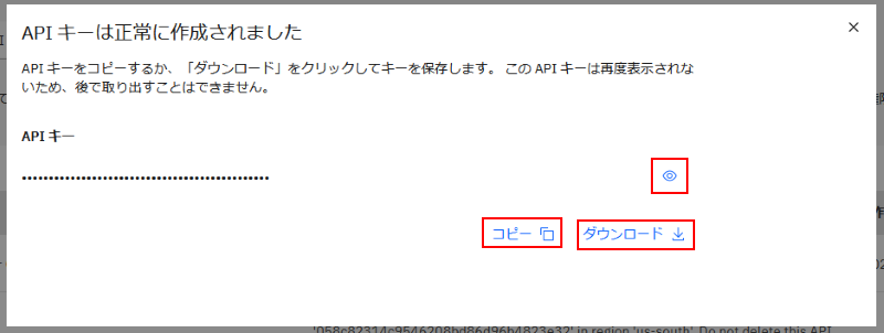 正しく実行できると以下のような画面になります。作成された API キーはマスクされ、表示されていません。この画面をこのまま閉じてしまうと作成された API キーの内容を再度確認することはできなくなるため、ファイルでダウンロードしておくか、クリップボードにコピーしておくか、目のアイコンをクリックして、マスクを外して表示し、その内容をどこかに保存しておく必要があります:
