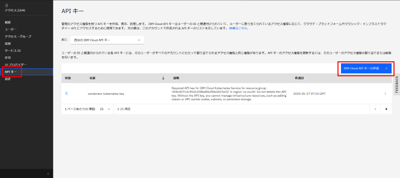 別ウィンドウでアクセス設定画面が開いたら、画面左メニューで「API キー」を選び、「IBM Cloud API キーの作成」ボタンをクリックします: