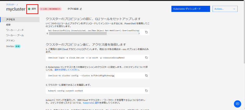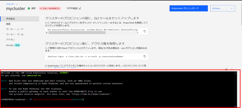 この画面を離れる前に Web 端末の準備もしておきます。この IKS で用意する Kubernetes 環境はローカルマシンの kubectl などから操作することも可能ですが、kubectl の環境を持っていない人でもブラウザ画面から利用できるターミナル機能が用意されており、こちらを使うことでローカルインストールや環境設定も不要で利用することができるようになって便利です。