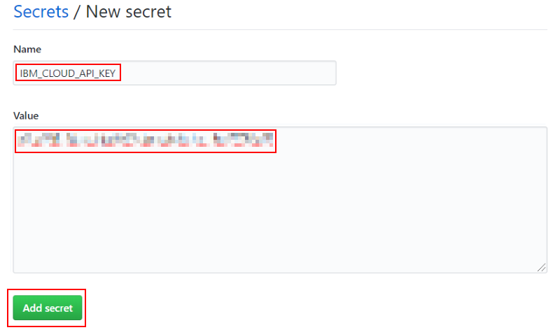 シークレット情報は名前(Name)と値(Value)の組で定義します。まずは "IBM_CLOUD_API_KEY" という名前のシークレットを定義します。この値としては上述した IBM Cloud 利用時に作成してダウンロードするかクリップボードに保存した IBM Cloud API Key の値を入力します。入力後に "Add secret" ボタンをクリックして保存します: