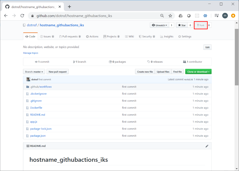 成功すると https://github.com/XXXXX/hostname_githubactions_iks というリポジトリができあがります(XXXXX 部分は各ユーザー個別の ID 名)。以降はこのリポジトリを使って GitHub Actions を利用します。まずこの URL を指定してリポジトリの内容をローカルに clone しておきます(XXXXX 部分は自分の ID に置き換えて実行してください):