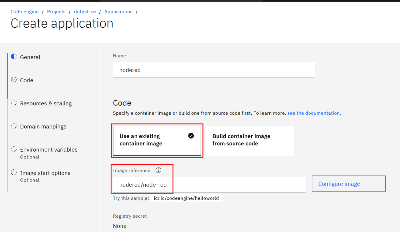 Code Engine を使う場合はアプリケーションの登録時に以下の設定をしてください。まず Code の種類は "Use an existing container image" を選択し、イメージ名は "nodered/node-red" と入力します: