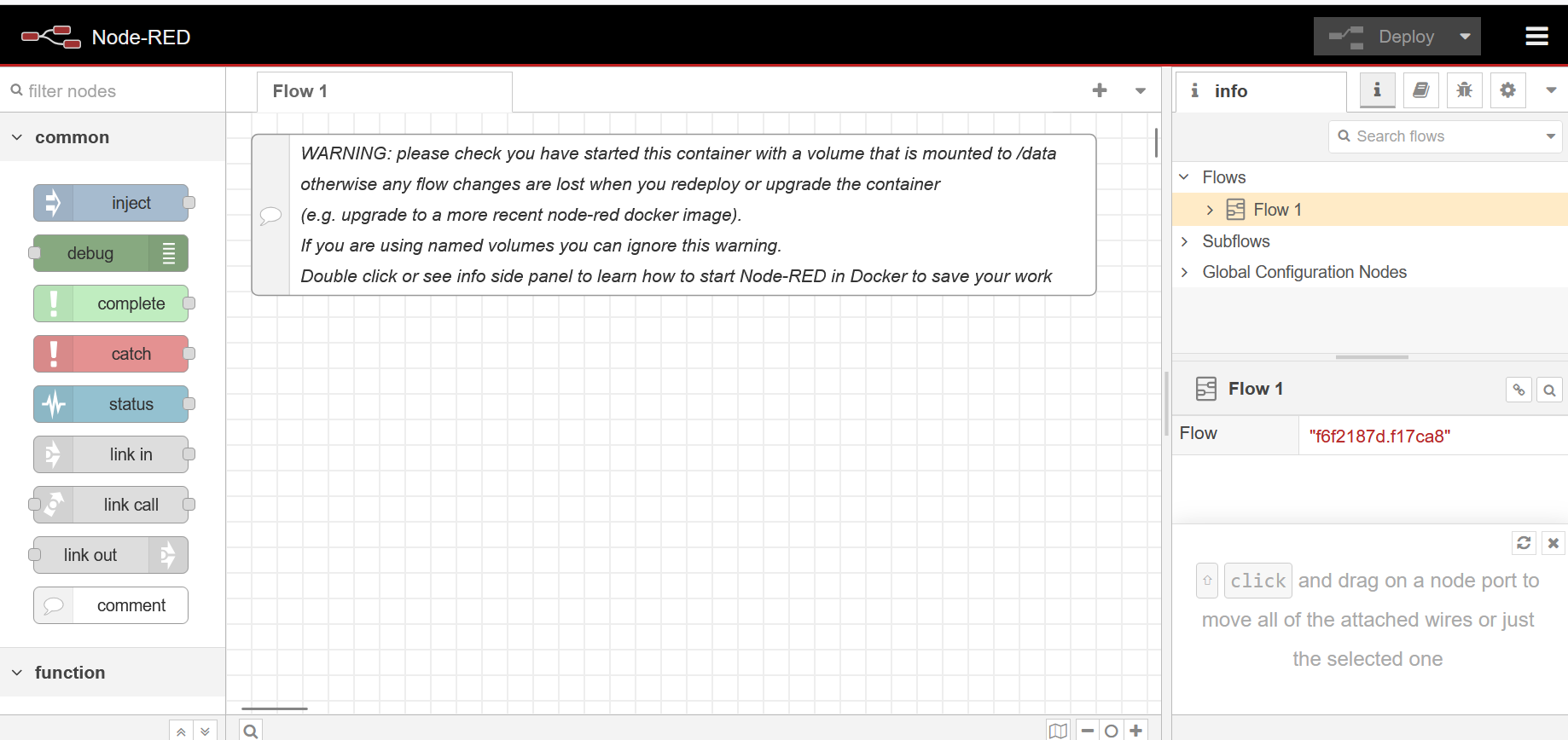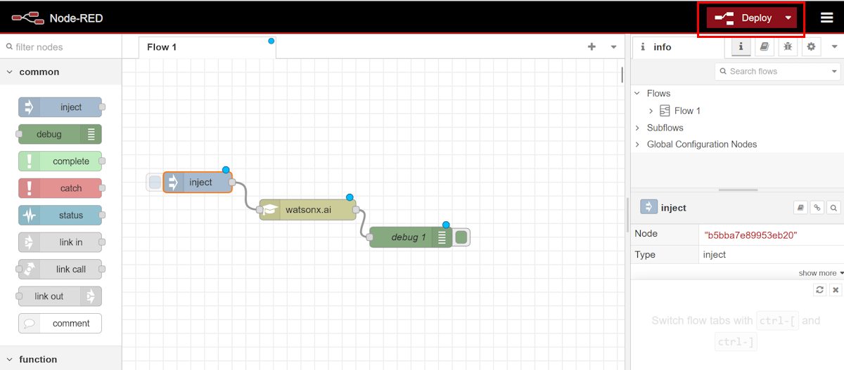 ここまで準備できたら、Node-RED 画面右上の "Deploy" ボタンをクリックして、このフローをデプロイします: