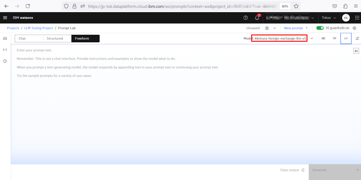 これらに指定するパラメータを確認しましょう。まずは watsonx.ai のプロンプトラボ画面を表示し、そこで指定するモデルをチューニングで作成したもの(下図では "kkimura-foreign-exchange-llm-v1")に設定します: