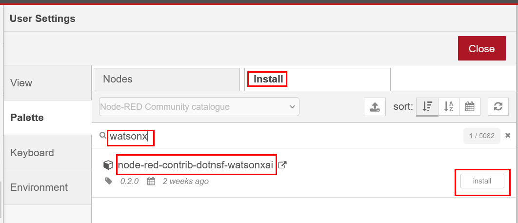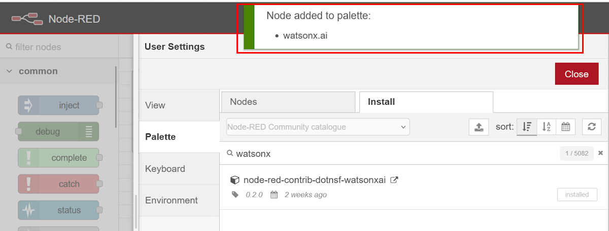 Node-RED から Watsonx.AI を使えるようにするため、用意した Node-RED に拙作の watsonx.ai ノードを追加します: