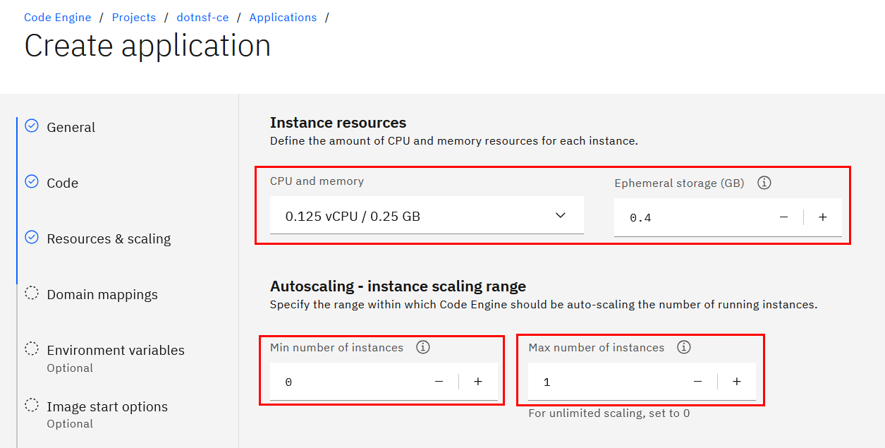 下にスクロールします。次にこの1アプリに使うリソース量を指定します。まず CPU とストレージは最小のものでいいと思います(多いほど値段が上がります)。注意が必要なのはその下の Autoscalling 設定です。この Max 値は 1 固定でいいのですが、問題は Min 値です。ここを 1 にするとアプリケーションは(最小インスタンス数=1、最大インスタンス数=1になるので)1つ起動しっぱなしになります。常に稼働しているため料金はそれなりにかかりますが、常に使える状態で待機していることになります。 一方、ここを 0 にすると(最小インスタンス数=0、最大インスタンス数=1になるので)アクセスがない時は消え、アクセスがあるとその場で1つ動き出します。アクセスのない時間帯の料金は(0インスタンスなので)かかりませんが、アクセスから実際にアプリケーションが動き出すまでのタイムラグがあり、また一度保存した状態があっても、アクセスがなく 0 インスタンスになってしまうと、次にアクセスした時には保存状態が残りません。いつでも使える状態がいいか、アクセスしない時間のコストをセーブするのがいいか、優先順位に合わせて選んでいただきたいのですが、以下の機能を試す間だけでも 1 に設定してインスタンスが落ちないようにしておくのがいいと思いました: