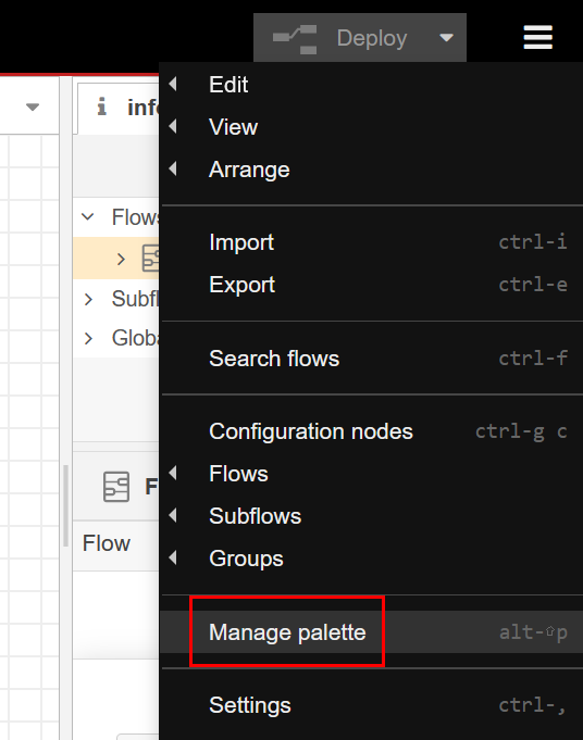 追加手順は以下です。まず Node-RED の右上のメニューから "Manage Pallete(パレットの管理)" を選択します: