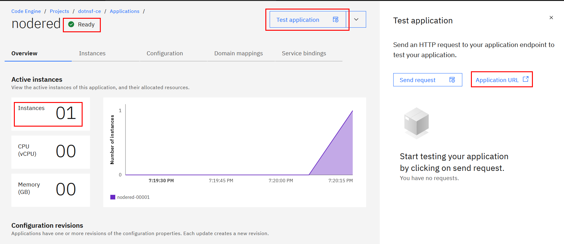 1~2分でアプリケーション(=Node-RED)が起動します。ステータスが "Ready" になったら "Test application" から "Application URL" を選択すると実際のアプリケーション(=Node-RED)にアクセスできます: