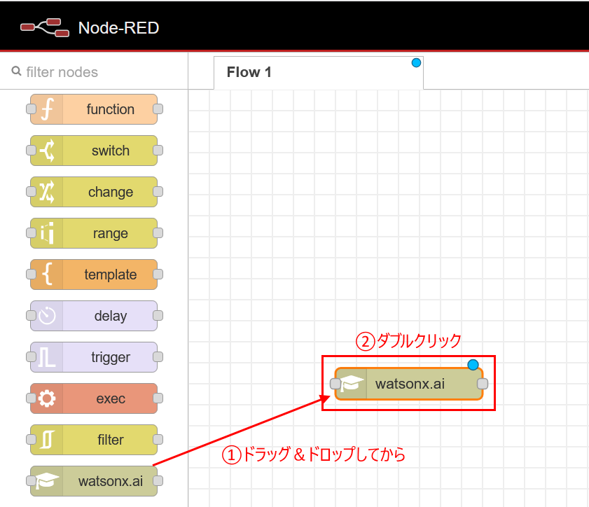 まず watsonx.ai ノードを左のパレット一覧から右のフロー部分にドラッグ&ドロップし、その後ダブルクリックしてください: