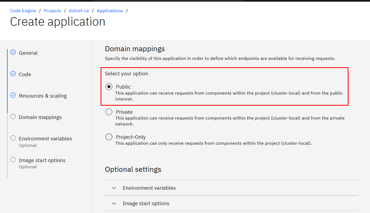 そしてドメインマッピングの設定は "Public" を選択し、最後に "Create" ボタンで作成します:
