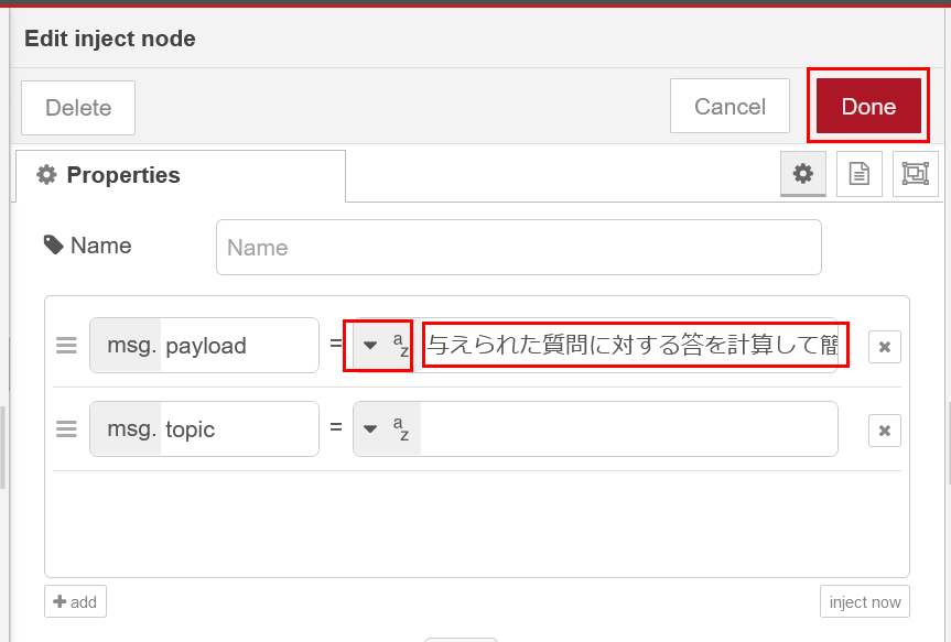 inject ノードをダブルクリックしてダイアログを開き、"msg.payload" の種類を文字列に(図で az と書かれている指定)、文字列の内容を "与えられた質問に対する答を計算して簡潔に答えてください。\\\\n\\\\n1 ドルは 144.3 円です。 10 ドルは何円ですか?" と入力して、Done をクリックします(msg.topic は使いません。×をクリックして削除しても構いません):