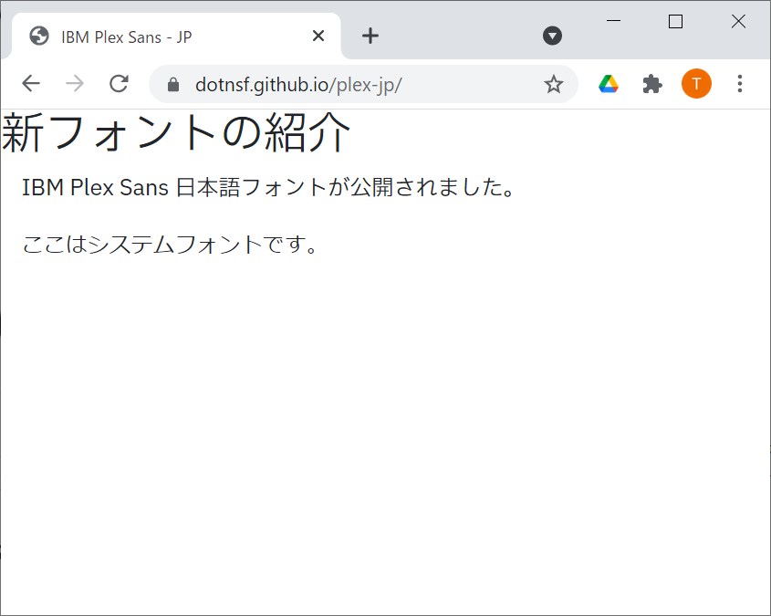 <p class="ibmplex" style="font-size: 1em;">あいうえお</p> のように記述すると、クラスを指定した要素は IBMPlexSansJP-Regular.otf フォントで表示されるようになります:あとはこの HTML, CSS とフォントファイルをまとめてサーバーにアップロードすれば、フォントが埋め込んだページが公開されます。サンプルとしてはこんな感じ: