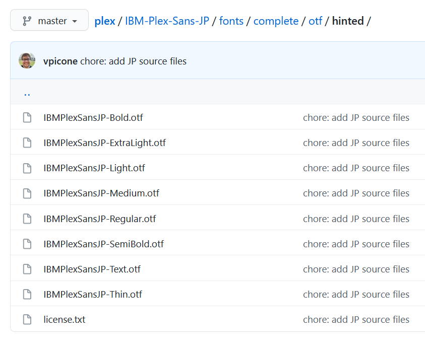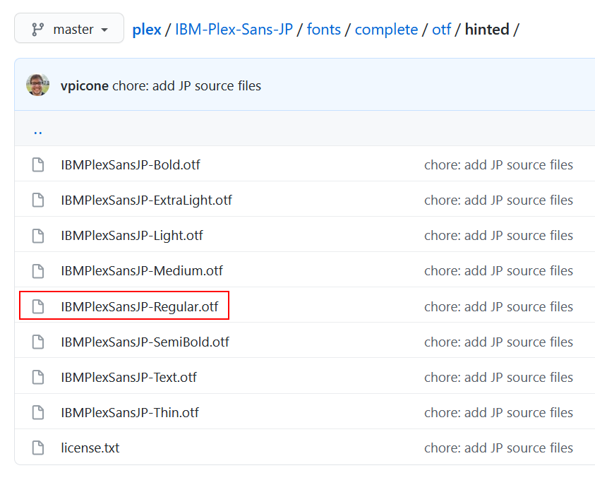ここから目的のフォントを1つ(2つ以上でもいいですけど・・)選んでダウンロードします。とりあえず普通そうな(最後に Regular とある)フォント IBMPlexSansJP-Regular.otf を選んでダウンロードします: