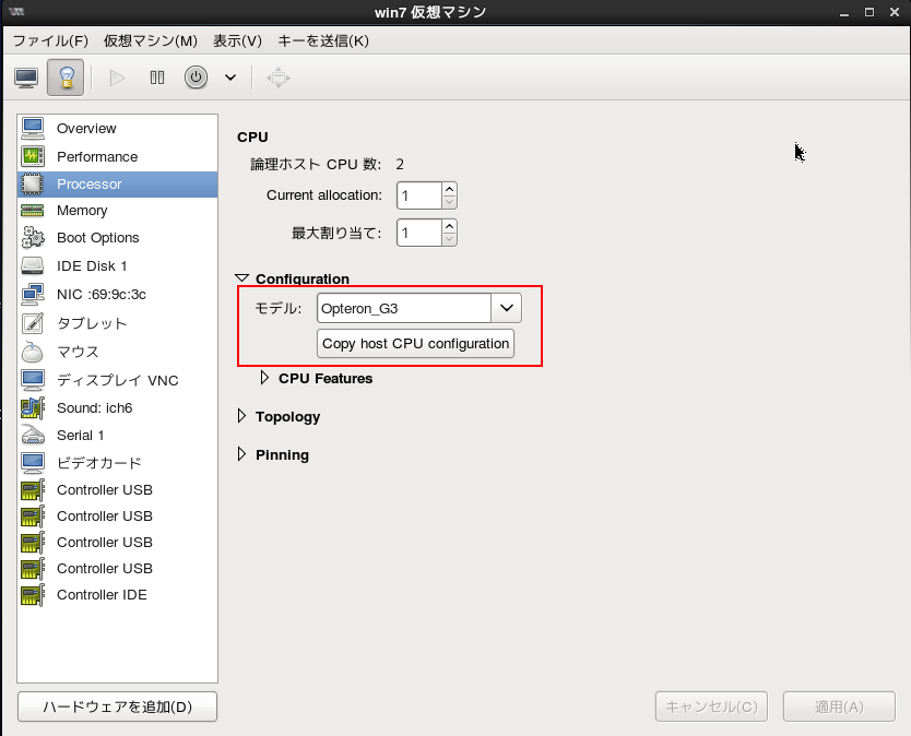 試しにここで "Copy host CPU configuration" ボタンを押して、ホストマシンの CPU 情報を参照して同じ設定にしてみました(モデル欄には "Opteon_G3" という値が自動入力されました。この値でなくても、ホストで使われている CPU の値が指定されていれば大丈夫だと思います)。この状態で「適用」しました:
