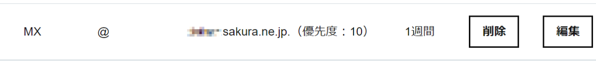 ホスト名: (対象ドメイン名) TYPE: MX VALUE: xxxxx.sakura.ne.jp(初期ドメイン名) 状態: 有効 優先度: 10 (など、適当な値)