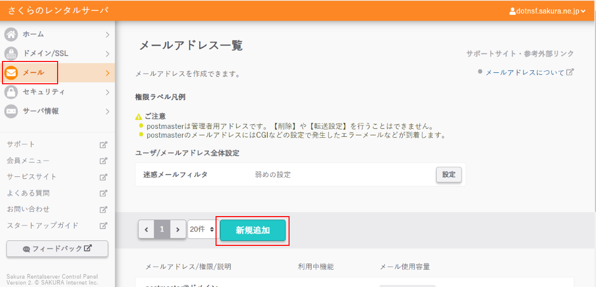 さくらインターネットのサーバーコントロールパネルに戻ります。今回はメールのユーザーを指定するので「メール」メニューを選択してメールアドレスの一覧を表示し、「新規追加」ボタンをクリックします: