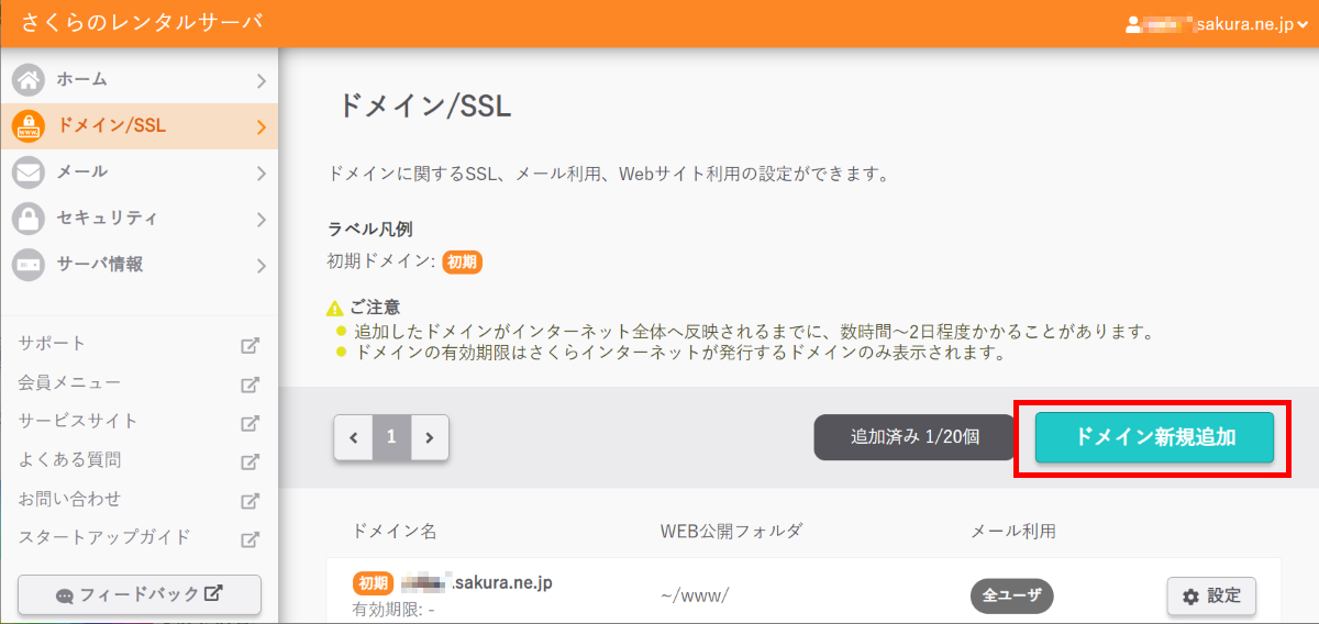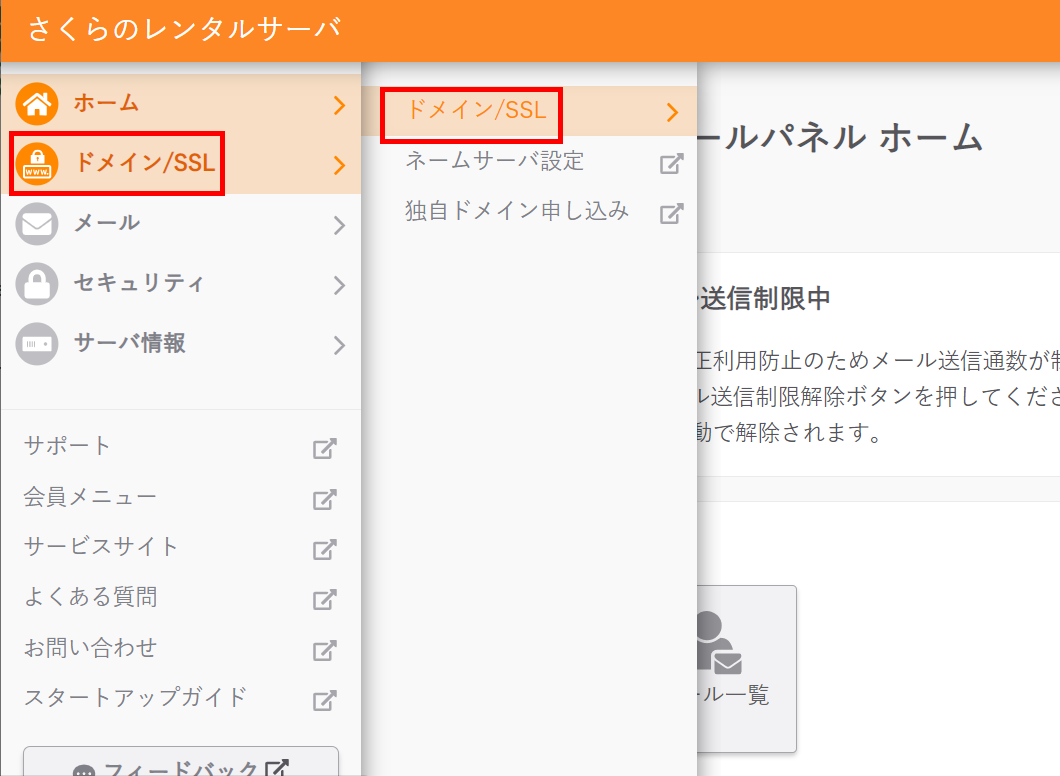 画面左のメニューから「ドメイン/SSL」 - 「ドメイン/SSL」 を選択します: