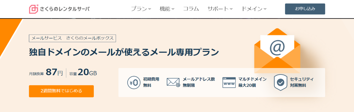 この状況を避けるべく、(無料ではないが)格安で独自ドメインのメール環境を用意してくれる環境を用意することにしました。その例として今回申し込んだのはさくらインターネット様の「さくらのメールボックス」サービスです: