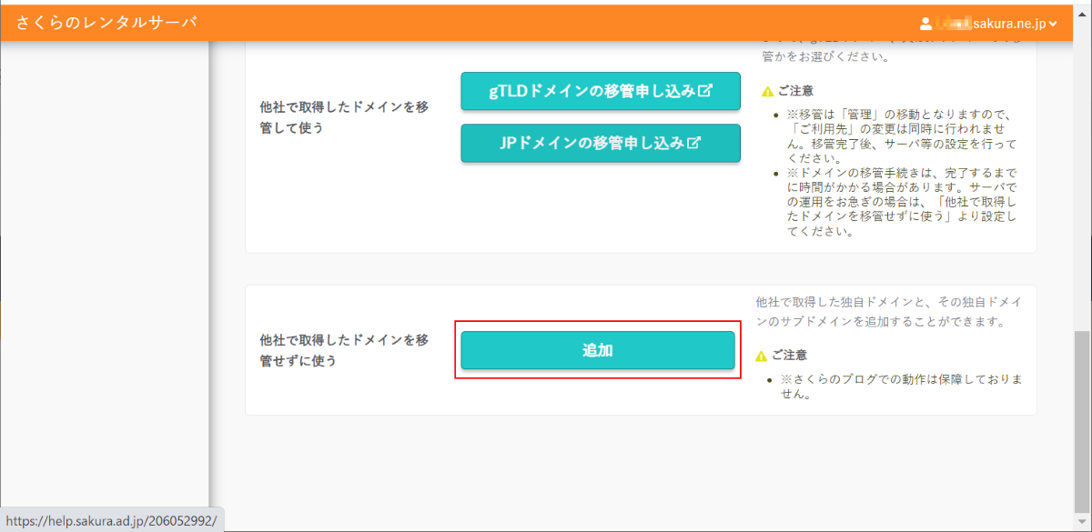 ドメインの管理そのものを移管する場合は「他社で取得したドメインを移管して使う」から先に進むことになりますが、今回はドメイン管理をそのままにして、メールサーバーの設定のみを行います※。というわけで一番下までスクロールして「他社で取得したドメインを移管せずに使う」の「追加」をクリックします: