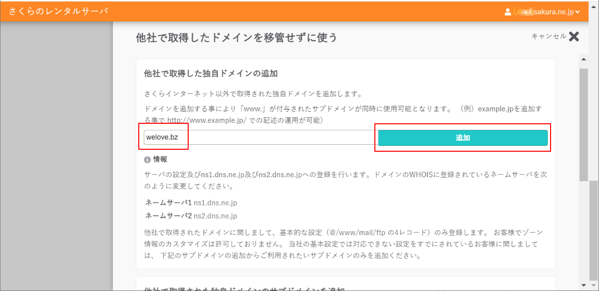 次の画面ではメールサーバーで移管するドメイン(下図では "welove.bz")を指定して「追加」します。ネームサーバーについて云々・・・と書かれていますが、今回ネームサーバーを現行のものから変更するつもりはないので、ここは無視します: